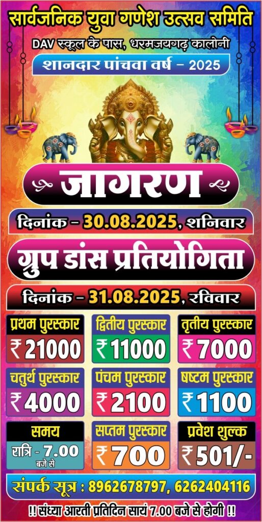 धरमजयगढ़ । धरमजयगढ़ कॉलोनी में विगत 27 अगस्त से गणपति जी विराजे हुए है । युवा समिति के तत्वधान में दिन प्रति दिन यहां का गणेश उत्सव भव्य से भी भव्य होता चला जा रहा है । जहां रोज भोग भंडारा के साथ साथ सांस्कृतिक कार्यक्रम भी हो रहा है । इसी क्रम में आज 31 अगस्त को भव्य ग्रुप डांस प्रतियोगिता रखा गया है । जिसमें छत्तीसगढ़ के विभिन्न जिलों से कलाकार अपनी प्रस्तुति देने यहां पहुंचेंगे । इस प्रतियोगिता ने प्रथम पुरस्कार 21000 Rs और ट्रॉफी रखा गया है । दुसरा पुरस्कार 11000 Rs और ट्रॉफी , तीसरा पुरुस्कार 7000 Rs और ट्रॉफी , इसी क्रम में 4000 Rs, 2100 Rs , 1100 Rs और 700 Rs और सांत्वना पुरस्कार के साथ इनाम की राशि रखी गई है । सार्वजनिक युवा गणेश उत्सव समिति द्वारा सभी नगरवासी एवं श्रद्धालु तथा भक्तों से ये निवेदन की है कि वे अधिक से अधिक संख्या में आज के इस कार्यक्रम में बढ़ चढ़ के हिस्सा ले और भोग भंडारा में अपनी उपस्थित दर्ज करे । इस समिति में सभी युवा साथी के सहयोग से ही ये समिति दिन प्रति दिन नए मुकाम हासिल कर रही है ।
