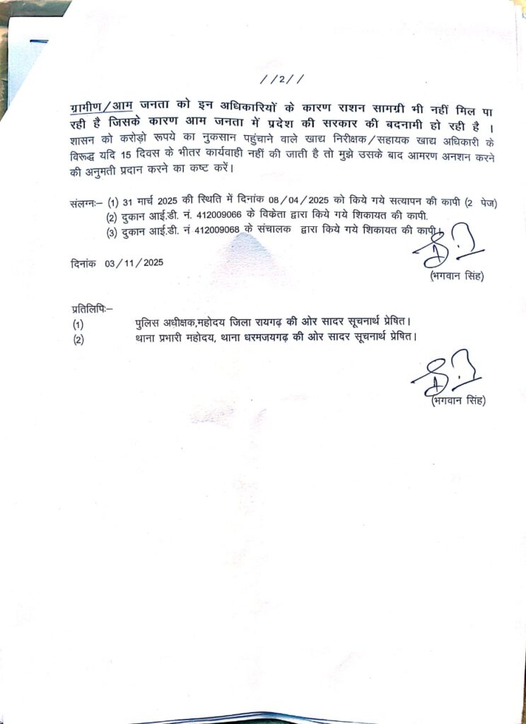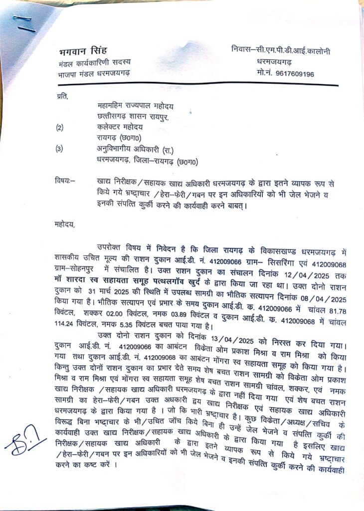 धरमजयगढ़ विकासखण्ड के अंतर्गत संचालित शासकीय उचित मूल्य की दुकानों में भारी अनियमितता और गबन का मामला सामने आया है। मंडल भाजपा कार्यसमिति सदस्य भगवान सिंह ने चेतावनी दी है कि यदि 15 दिनों के भीतर राशन वितरण में हुई धांधली की निष्पक्ष जांच नहीं की गई तो वे आमरण अनशन पर बैठेंगे।