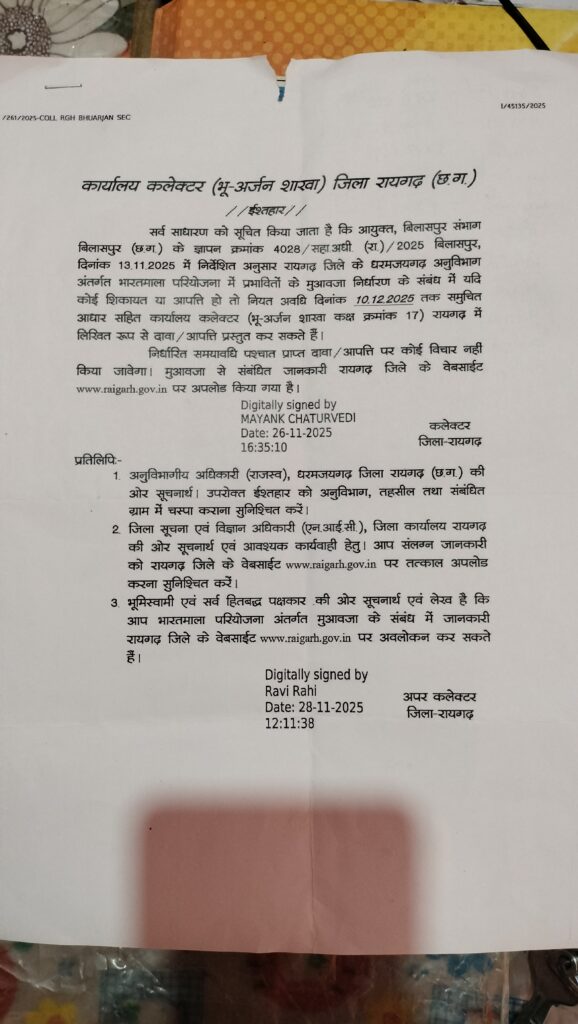कार्यालय कलेक्टर भू अर्जन शाखा जिला रायगढ़ छत्तीसगढ़ द्वारा दिनांक 26/11/2025को इश्तहार जारी कर सर्वसाधारण को सूचित किया गया है कि आयुक्त बिलासपुर संभाग बिलासपुर छत्तीसगढ़ के ज्ञापन क्रमांक 4028 सहा. अधी.(रा.)/2025बिलासपुर के निर्देश दिनांक 13/11/2025 को रायगढ़ जिले के धरमजयगढ़ अनुविभाग अंतर्गत प्रभावित किसानों की मुआवजा निर्धारण के संबंध में यदि कोई दिक्कत या आपत्ति हो तो दिनांक 10/12/2025 तक समुचित आधार सहित कार्यालय कलेक्टर भू अर्जन शाखा कक्ष क्रमांक 17 रायगढ़ में लिखित रूप से दावा/ आपत्ति प्रस्तुत कर सकते है.तथा निर्धारण समयावधि पश्चात प्राप्त दावा/आपत्ति पर विचार नहीं किया जाएगा सम्पूर्ण जानकारी जिले के वेबसाइट www.raigarh.gov.in पर अपलोड किया गया है जिसे सर्व भूमि स्वामी एवं हितबद्ध पक्षकार उपरोक्त वेबसाइट पर अवलोकन कर सकते है. इस परियोजना में दो तीन गांव के कुछ किसानों यानी दस बारह लोगों को मुआवजा अभी तक अप्राप्त है अनुविभाग के अंतर्गत 7 किमी सड़क kpcl कोयला कंपनी की भूमि पर होने से यहां कार्य अभी तक आरंभ नहीं हुआ है.इधर कुछ स्वार्थी तत्व अपने हित के लिए पेशा कानून को गलत परिभाषित कर रहे है.तथा सड़क निर्माण एवं रेल परियोजना में मलाई खा चुके हैं तथा इस परियोजना में भूमि का मुआवजा अप्राप्त लोगो के लिए कोई उचित मार्गदर्शन भी नहीं कर रहे है.परन्तु सरकार द्वारा उपरोक्त इश्तहार के आधार पर भू अर्जन शाखा जाकर अपराप्त भूमि मुआवजा किसान दवा/ आपत्ति कर सकता है।