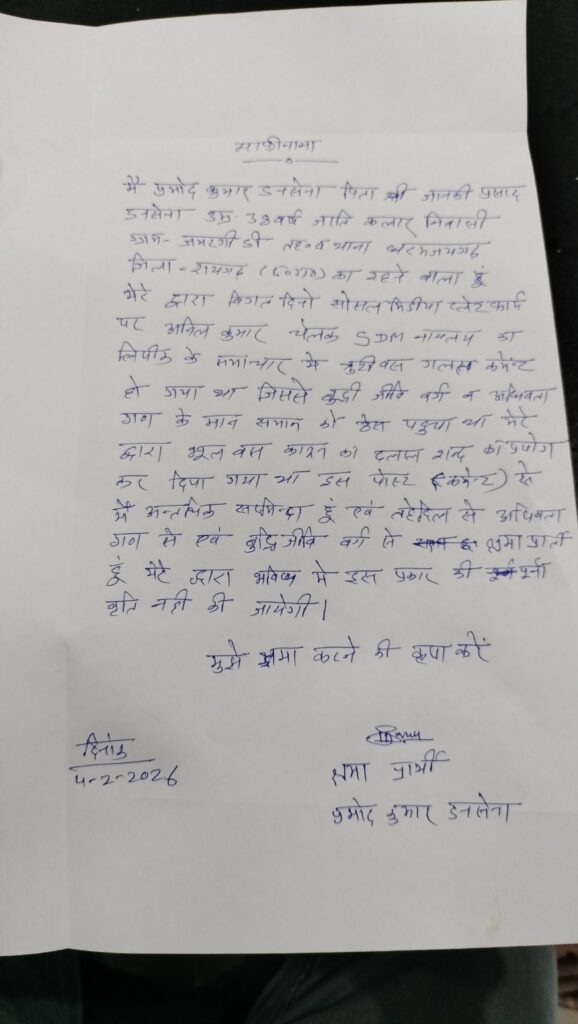 विवाद बढ़ने के बाद 4 फरवरी को युवक ने अधिवक्ताओं के समक्ष प्रस्तुत होकर बार कक्ष में एक लिखित माफी पत्र सौंपते हुए स्वीकार किया कि उसके द्वारा सोशल मीडिया पर की गई टिप्पणी गलत और अनुचित थी।