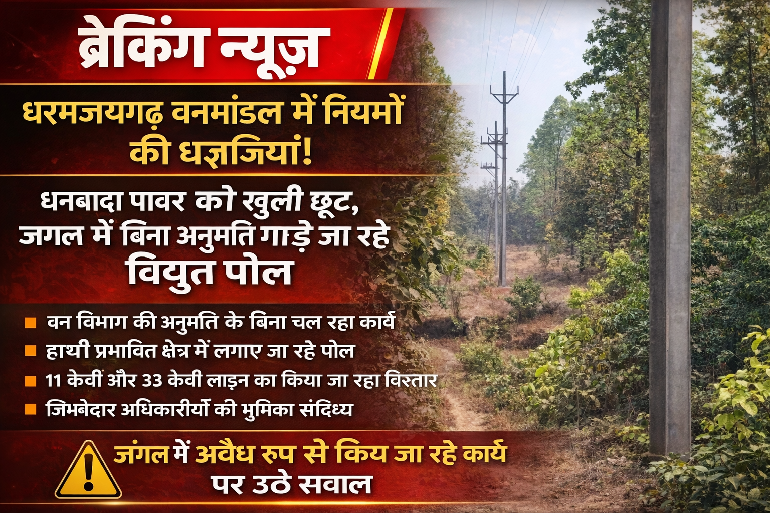 धरमजयगढ़ वनमंडल में नियमों की धज्जियां! धनबादा पावर को खुली छूट, जंगल में बिना अनुमति गाड़े जा रहे विद्युत पोल-
